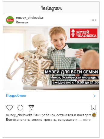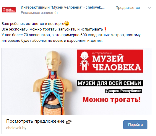 Музей человека- интерактивный музей для всей семьи. Адрес: Минск, Октябрьская пл. 1 (Дворец республики) 23 января 2019 г. было открытие, в этот день стартовали работы по продвижению в соц. сетях.На начальном этапе были выбраны соц. сети: Фейсбук и Вконтакте